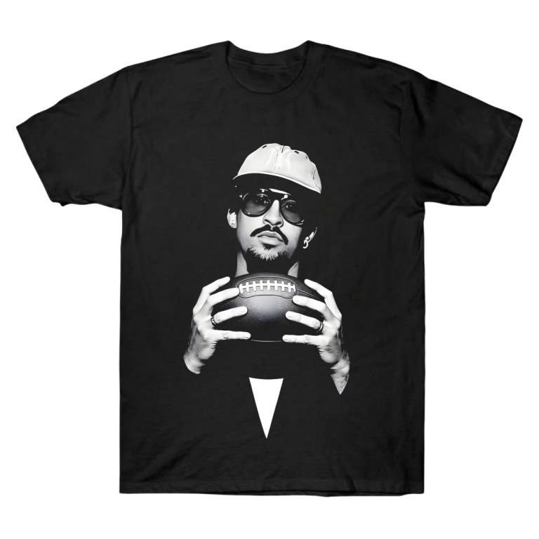 Own the stadium vibe with this Bad Bunny tee, featuring a B&W football portrait in a bold aesthetic design made for iconic streetwear looks. Shop now!