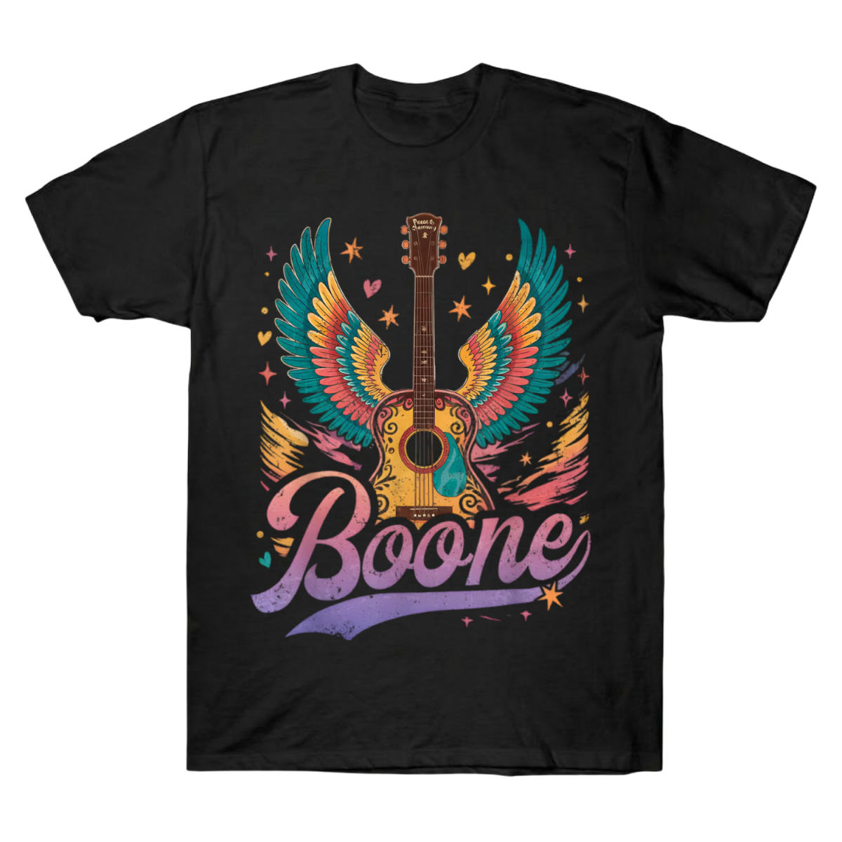 Own the ultimate soulful vibe with this premium Benson Boone inspired guitar wings tee. Featuring vibrant retro art and iconic “Boone” script. Shop now!