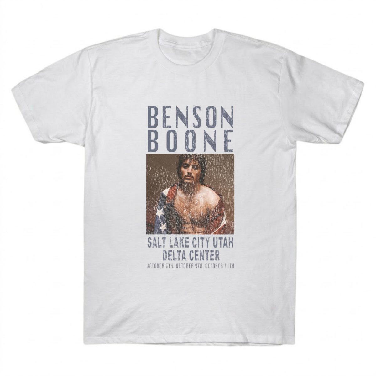 This one-sided design is the ultimate tribute for true fans. It features a stunning, high-fidelity portrait of Benson Boone looking intensely through the rain, with the American flag draped over his shoulder, capturing his raw and authentic aesthetic. Framed by tall, distressed blue-grey typography and detailing the iconic October dates (8th, 9th, and 11th) at the Delta Center in Salt Lake City, Utah, it mirrors the classic, gritty look of 90s bootleg concert merchandise.