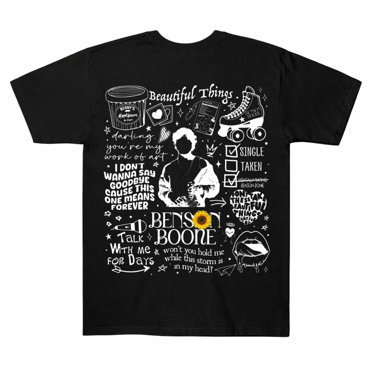 “Mentally dating Benson Boone.” Own the vibe with this Benson Boone tee, featuring a sunflower logo and “Beautiful Things” doodle collage on the back. Shop now!