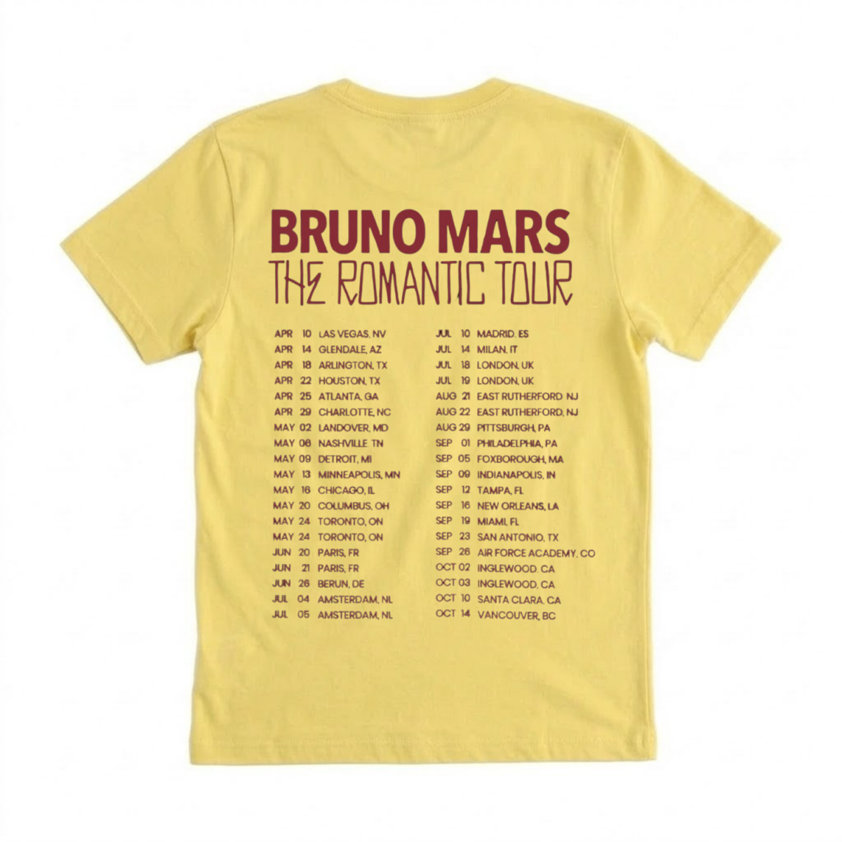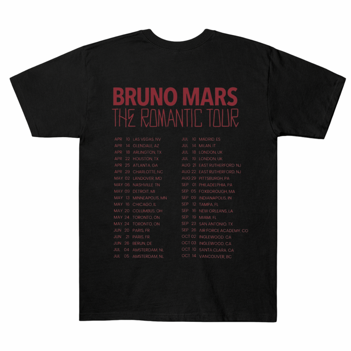 Own the concert vibe! This Bruno Mars two-sided tee features the angel wings portrait on the front and 2026 tour dates on the back. Shop now!