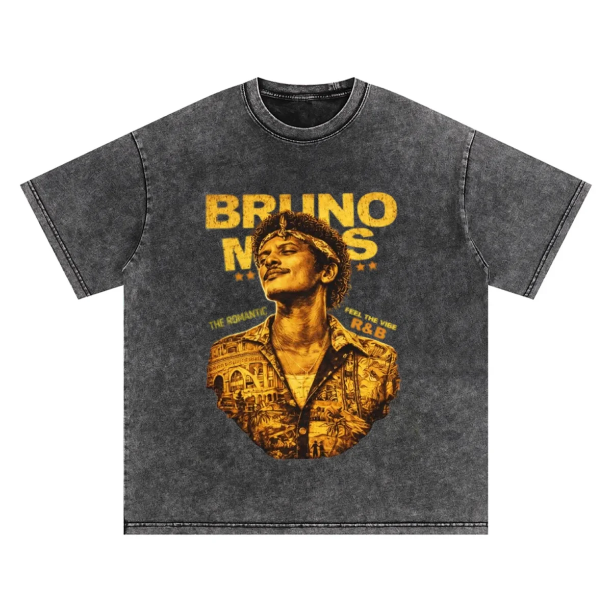 Feel the soul with this Bruno Mars vintage wash tee, featuring a bold R&B portrait and “The Romantic” vibe in a stylish street-ready design. Shop now!