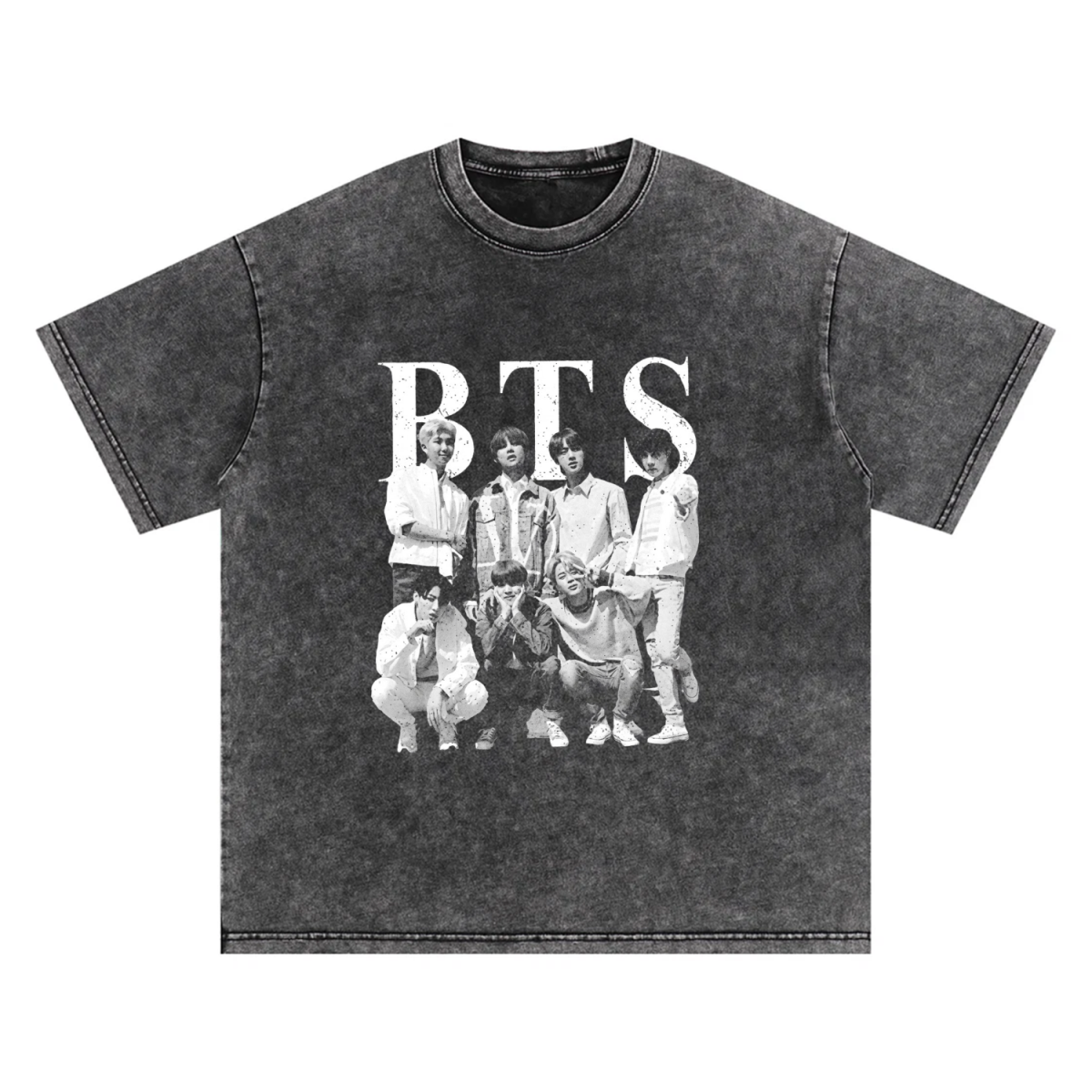 Get the ultimate 90s throwback! This premium BTS acid wash tee features a bold monochrome group photo and a distressed vintage backdrop. Shop now!