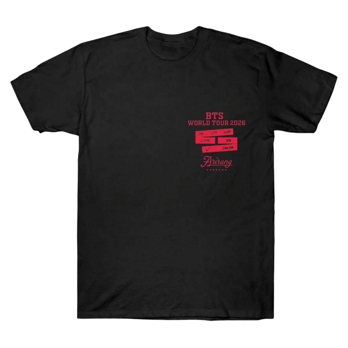 This double-sided design is the definitive collector’s piece for the reunion chapter. The front features a clean, high-fidelity red design on the left chest: the “BTS WORLD TOUR 2026” headline above the iconic member signature ribbon and the elegant “Arirang” script. Flip it over to reveal the massive official schedule, listing every stop from Seoul and Tokyo to Los Angeles, London, and beyond – stretching into 2027.