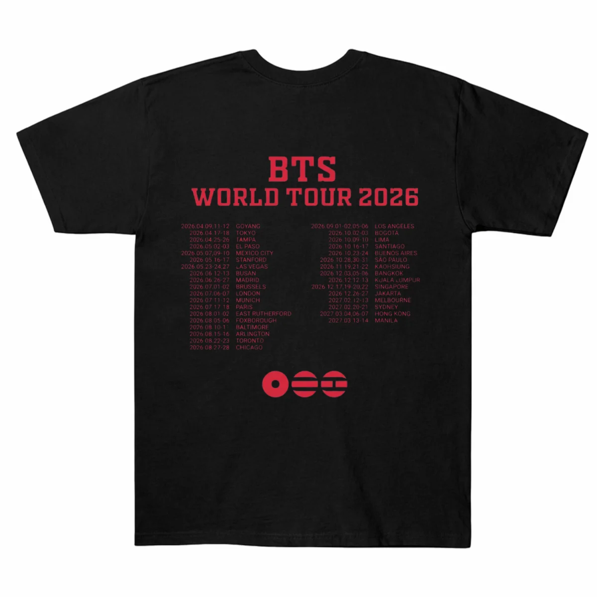 The ultimate 2026-2027 world tour staple! This BTS two-sided tee features the “Arirang” ribbon on the front and global tour schedule on the back. Shop now!