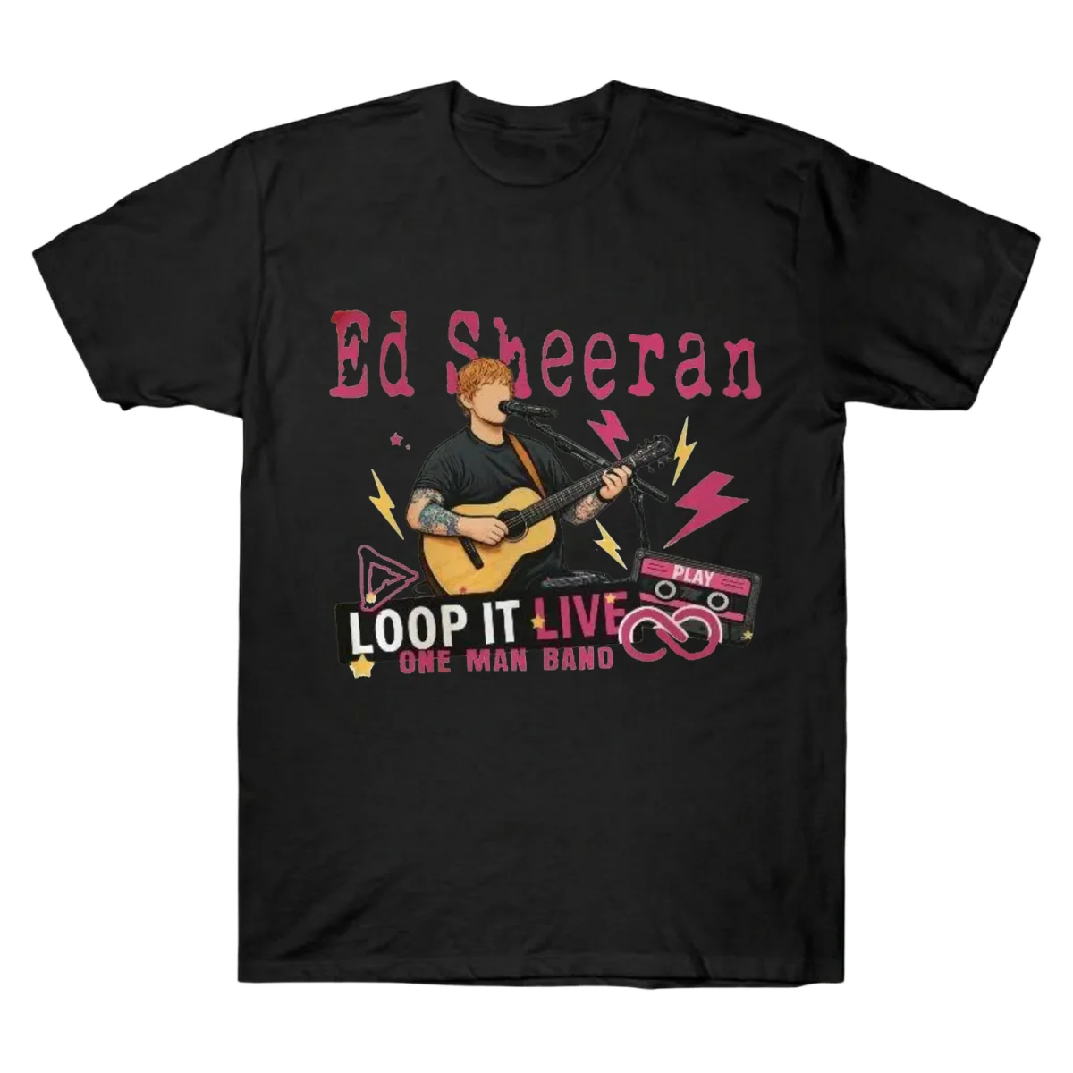 Experience the magic of the one-man band! This premium two-sided Ed Sheeran tee features iconic loop-station visuals and retro tour graphics. Shop now!