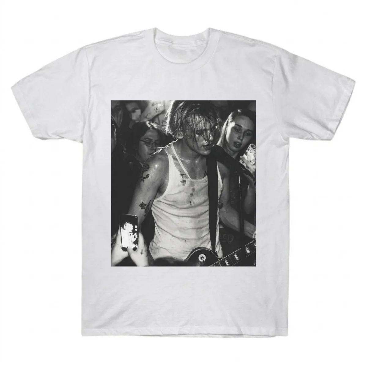 This design features a high-contrast, black-and-white concert photograph that mirrors the gritty, authentic spirit of a live show. It represents more than just a piece of clothing. It’s a tribute to the connection between an artist and their audience. Whether you’re in the front row or listening from your bedroom, this shirt is designed to make you feel part of the music journey.