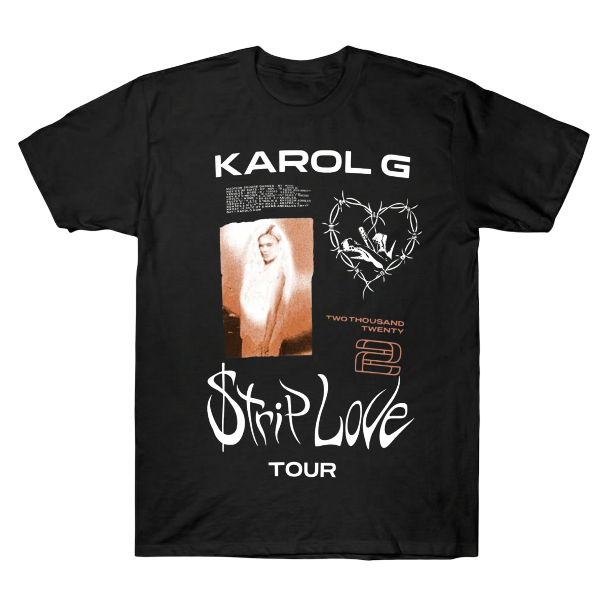Relive the legendary energy with the Karol G Strip Love Tour T-shirt. Iconic multi-panel graphics from the Coachella 2026 collection. Shop the star vibe!