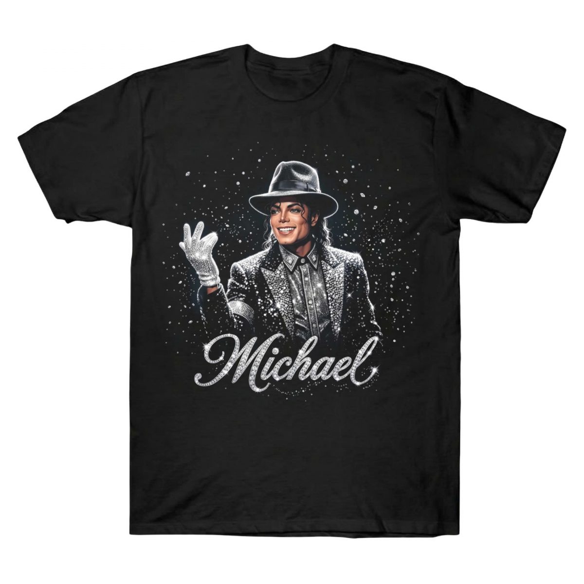 Own the ultimate sparkle with this Michael Jackson tee, featuring a high-fidelity portrait with his iconic sequin jacket and glove in a design. Shop now!