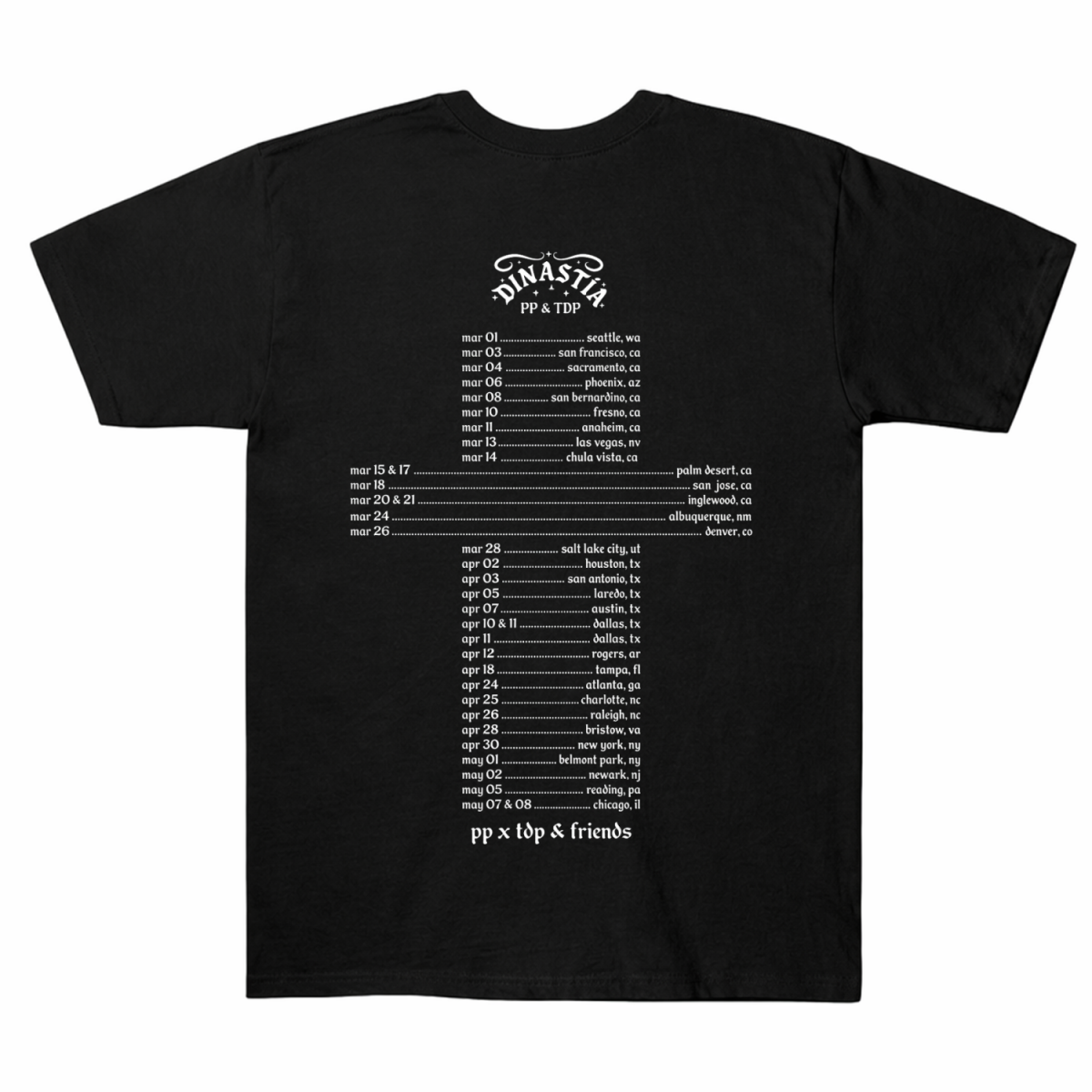 Own the premium two-sided Peso Pluma Dinastia tee. Features a chic front insignia and the massive “Cross-Formation” world tour schedule on the back. Shop now!