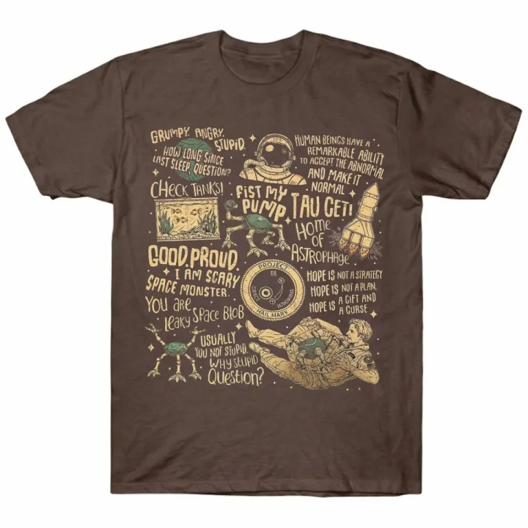 The universe is a chaotic collection of complex calculations and the “remarkable ability to accept the abnormal.” As we countdown to the highly anticipated 2026 premiere, we celebrate the most memorable moments and witty humor found in the world of Project Hail Mary. This isn’t just a garment, it is a wearable encyclopedia of a cosmic miracle. The Vintage Scrapbook Tee captures that heavyweight spirit, turning a nostalgic sci-fi aesthetic into a wearable memory you can carry every day.