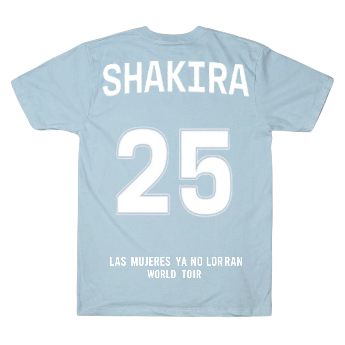Rep the tour with the Shakira LMNL World Tour Jersey Tee. Double-sided sporty graphics, number 25 back, and premium light blue cotton. Shop the vibe!