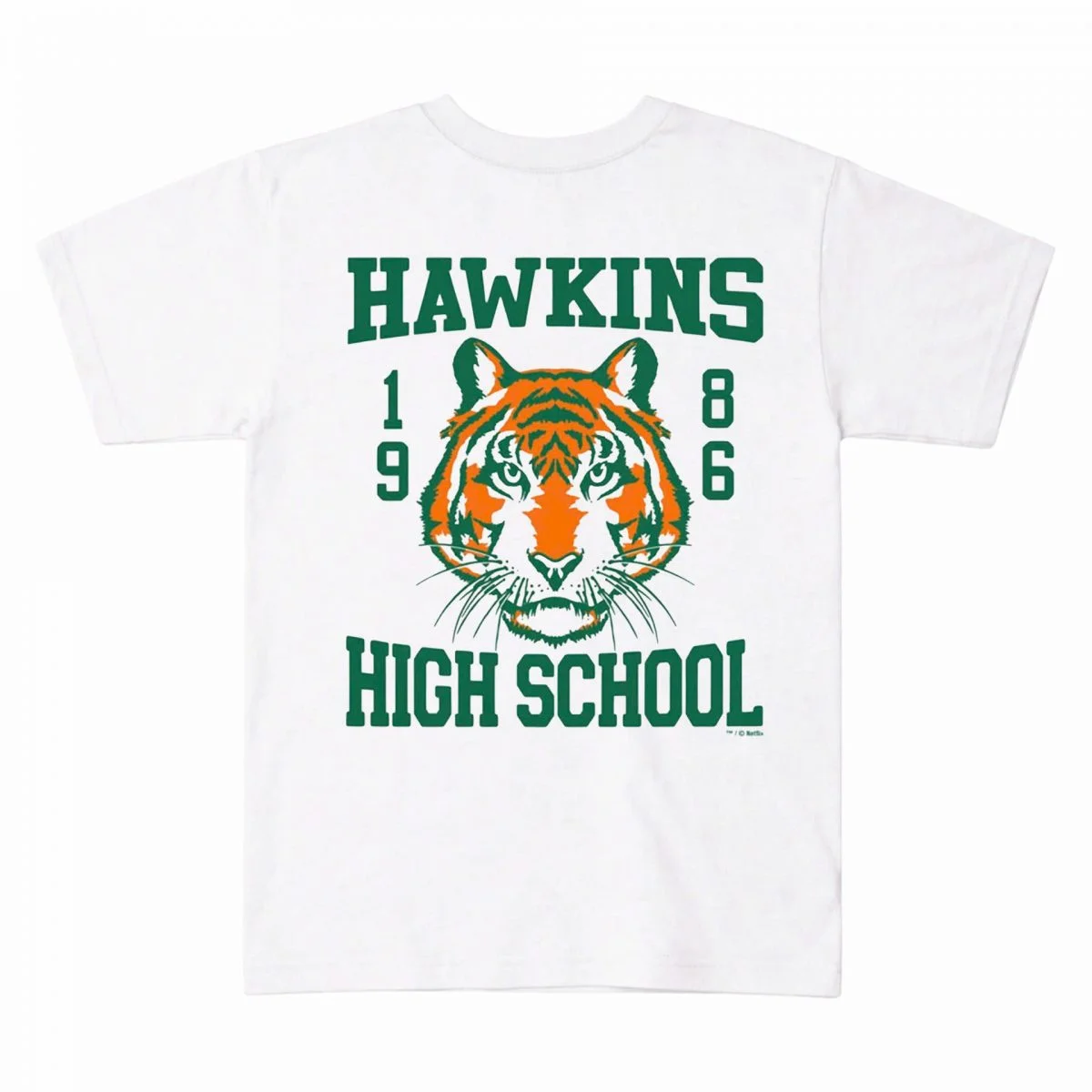 Go Tigers! Show your Stranger Things Hawkins High pride with this two-sided varsity tee, featuring the number 8 and 1986 mascot. Shop now and wear the mystery!