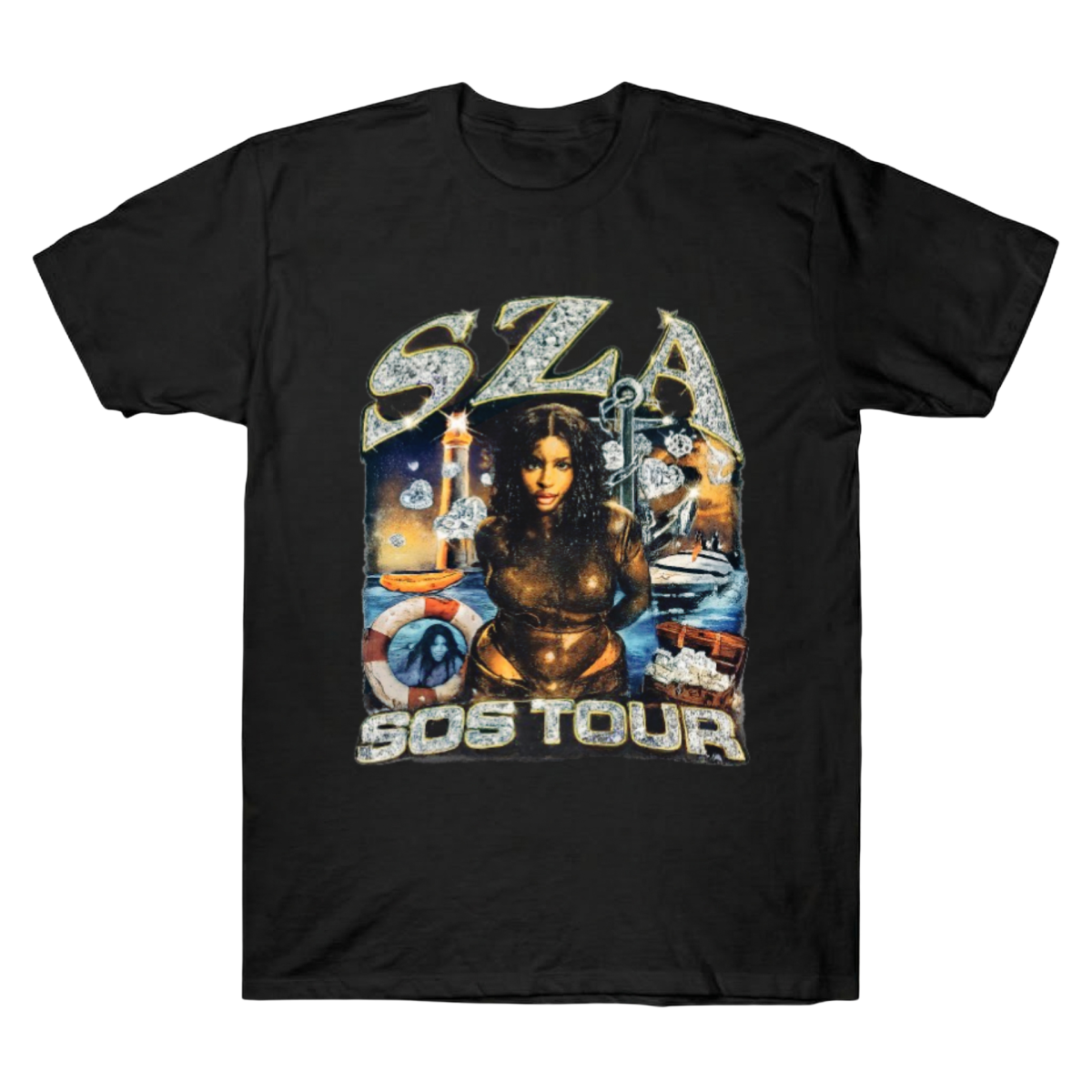 Rep the deep ocean vibes with the SZA SOS Tour Tee. Bold chrome graphics on premium black cotton. Shop the vibe now!